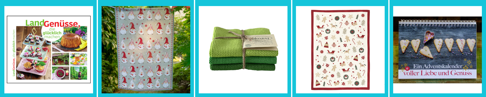 Weihnachtliche Geschirrtücher oder auch unser immerwährender Adventskalender mit köstlichen Plätzchenrezepten und anderen kulinarischen Überraschungen gehören dazu.